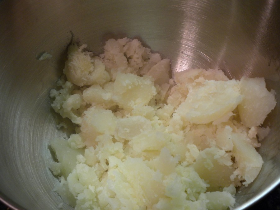 Scoop out baked potatoes and place in bowl