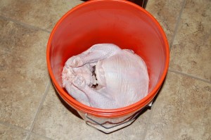 Put the brine and the gallon of iced water in the bucket.  Put the turkey in head first.  Okay, first time turkey cookers listen up.    Please make sure to remove all the giblets and the neck.  Look in both cavities!!!  Don’t laugh.  You don’t want to have  your brother-in-law  to carve the turkey and pull out the giblets still in the plastic bag.  That is a hard one to live down.