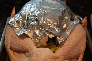 Make a covering from  foil to cover the breast.  Form it to the turkey then take it off and oil the side that will touch the turkey.  This is going to keep the breast from drying out.  Put this on the counter to use later. Do not cover the breast yet.
