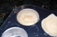 Using miniature muffin pans press each ball of dough into the pan with your finger.  Start by making an indention in the middle then pressing outward.  Be careful not to make the bottoms too thin because the filling will seep through and it will be hard to remove them from the pan.  That’s what happened to the two that GI Joe just popped into his mouth.  I guess he though they were good enough to eat , but not take a picture of.