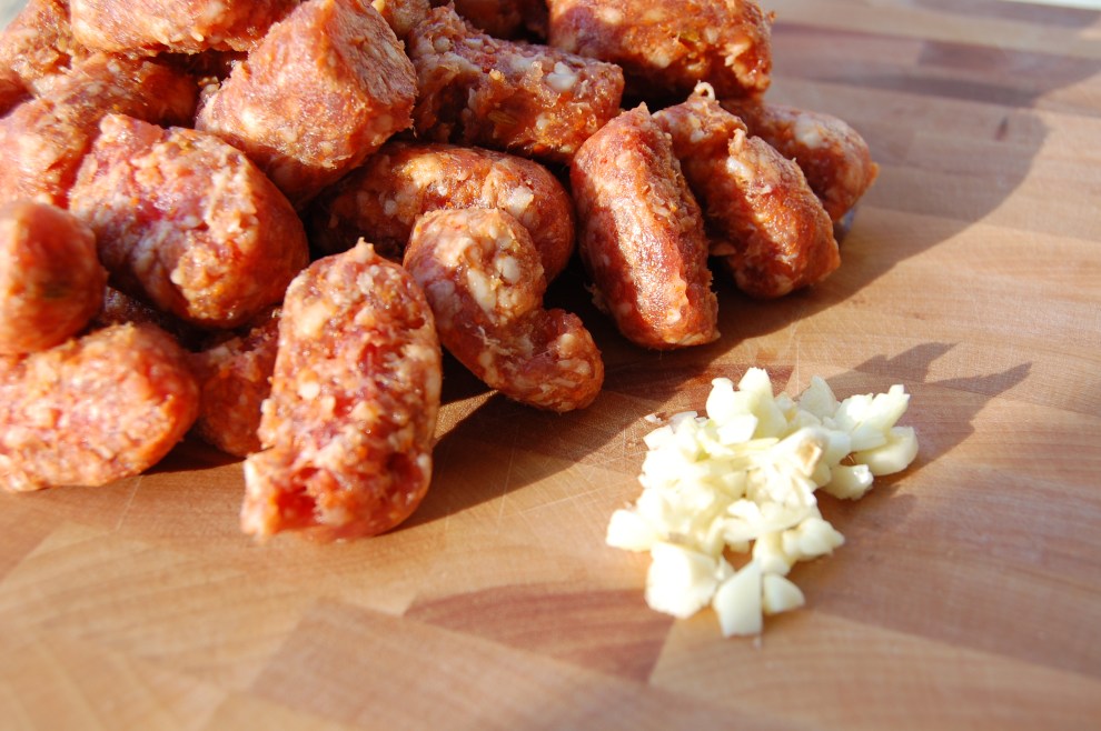 Over medium heat saute 1 clove garlic with sausage in 1/8 cup olive oil