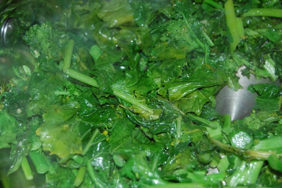 Saute raab in a separate pan with 1/8 cup of olive oil and 2 cloves of minced garlic until wilted and add to soup.  Serve immediately with grated parmesan cheese.