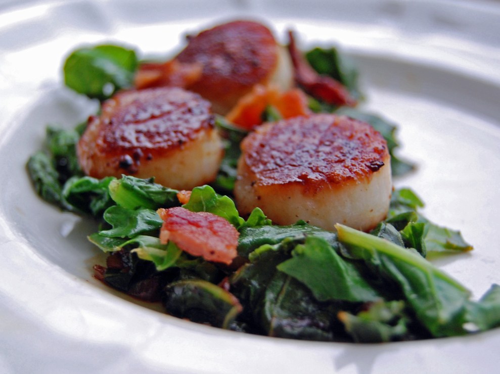 Pan-Seared Scallops with Bacon and Kale (They served spinach) Serves 4