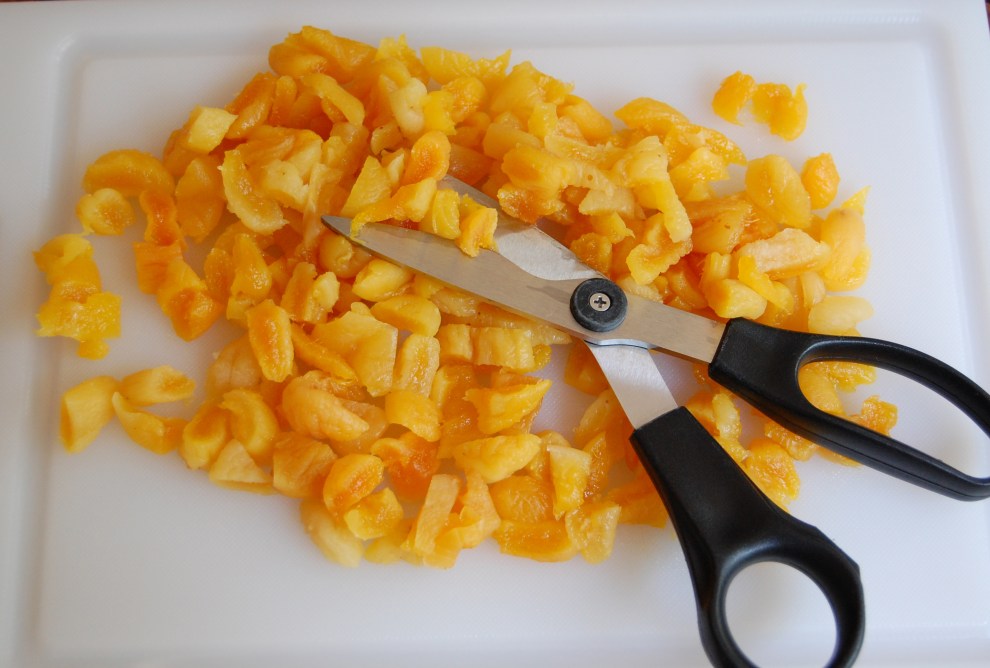 Use kitchen shears to cut the apricots. I’ve always used a knife but maybe shears are better.