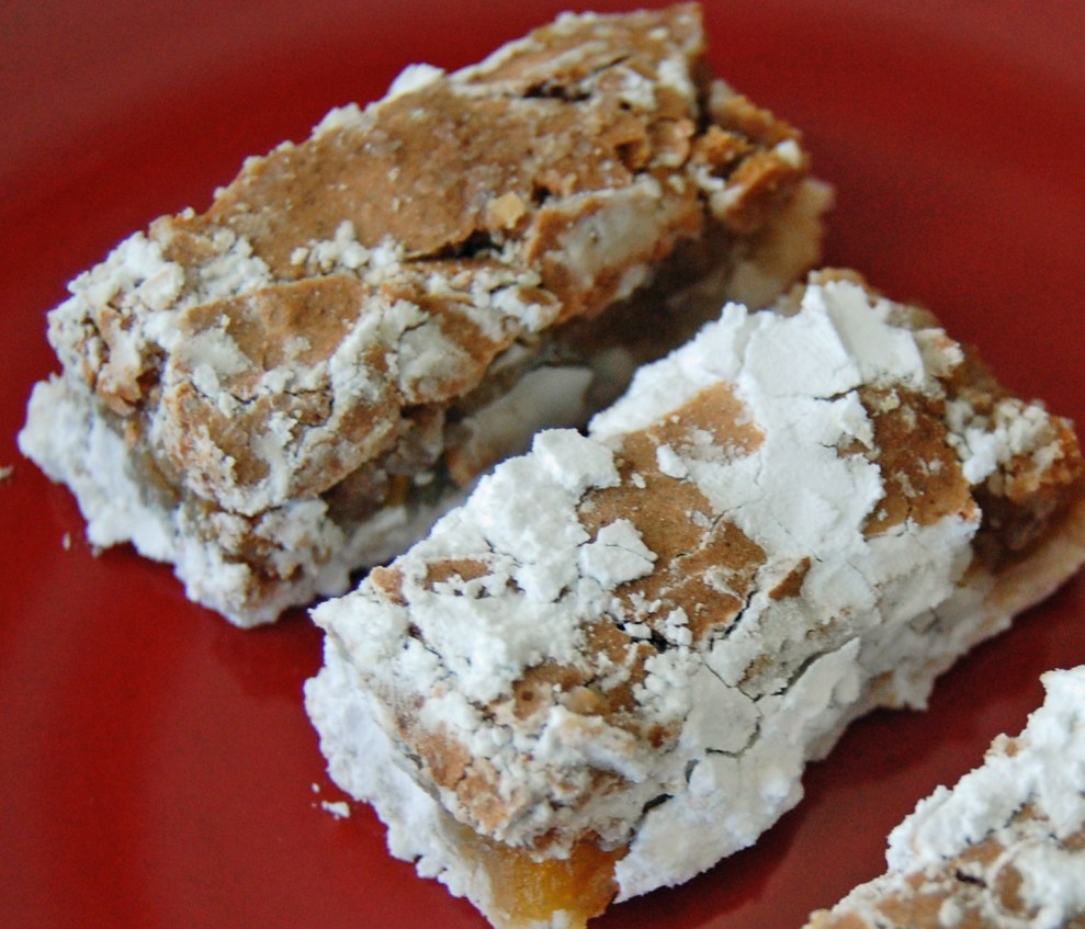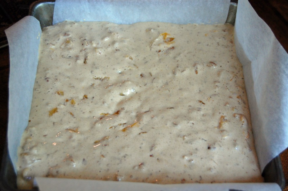 This looked really wrong to me so that is why I looked for hours for another recipe similar to this one.  I found another that used more flour in the bottom layer, but in the end they both tasted good.  I was afraid with the lacey texture that when I cut the bars they would just fall apart, but they held together just fine.  While the bottom layer is baking get the next layer together.  Start by boiling the apricots for about 10 minutes in enough water to cover them.Drain and let them cool.  Chop or use kitchen shears to cut them in small pieces.Beat eggs.  Sift together remaining flour, salt, and baking powder. Stir in brown sugar. Add eggs to the dry ingredients.  I used my handheld mixer. Stir in apricots, pecans and vanilla. Pour this on the cooked bottom layer and bake for about 25 minutes.These bars were very hard to judge  for doneness, especially since I had no idea what they were suppose to look like.  That’s why I am a picture girl when it comes to buying cookbooks.