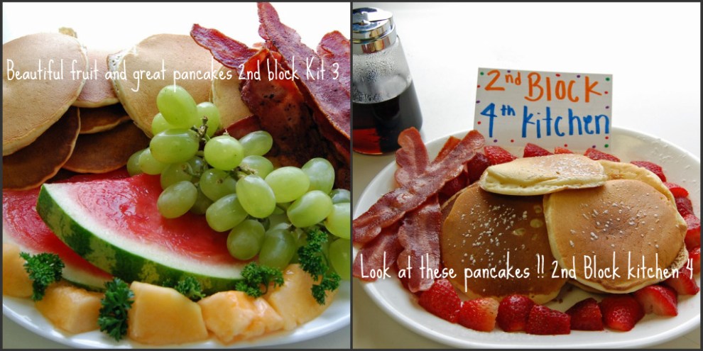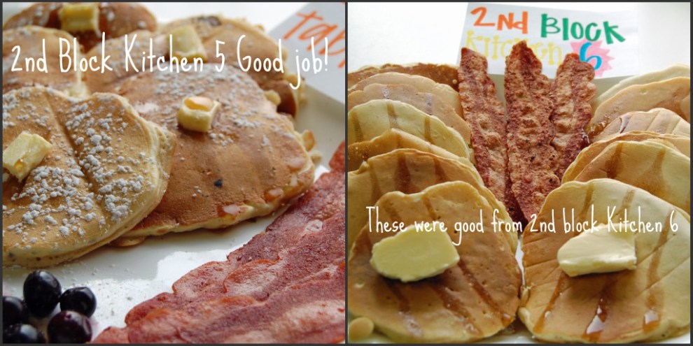 Each group could choose between this recipe and the Oatmeal- Brown Sugar Pancake recipe.  About third of the classes chose this one.  As the class  filled the halls with the aroma of pancakes baking and bacon cooking we had many visitors stopping by.  One of the students asked me, “Doesn’t if it bother you that so many people stop in to see what we were doing?”  My reply,” No, it is just good advertisement for my class.”