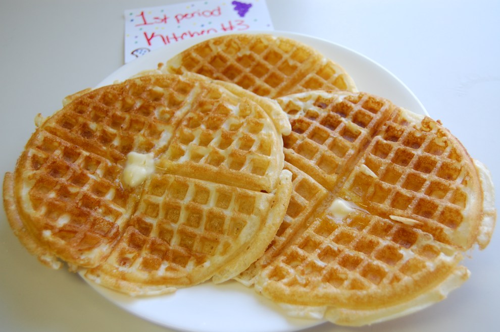 Here’s what my class did with the same recipe. Notice the difference in color. I have about fives types of waffle irons that they used. Some better than others. The lab was a huge success. I am loving the maturity of the juniors and seniors that I have this semester!
