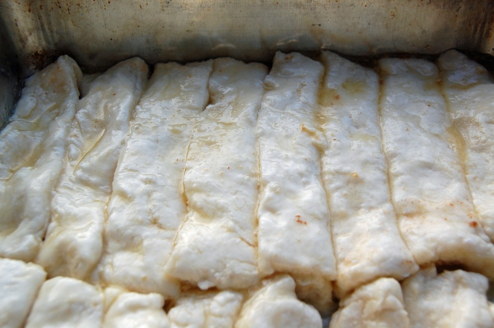 Dip each strip into the melted butter that is in the bottom of the pan.  The dough will be handled less if the top is dipped first. Turn the strip over and place in the pan close together.