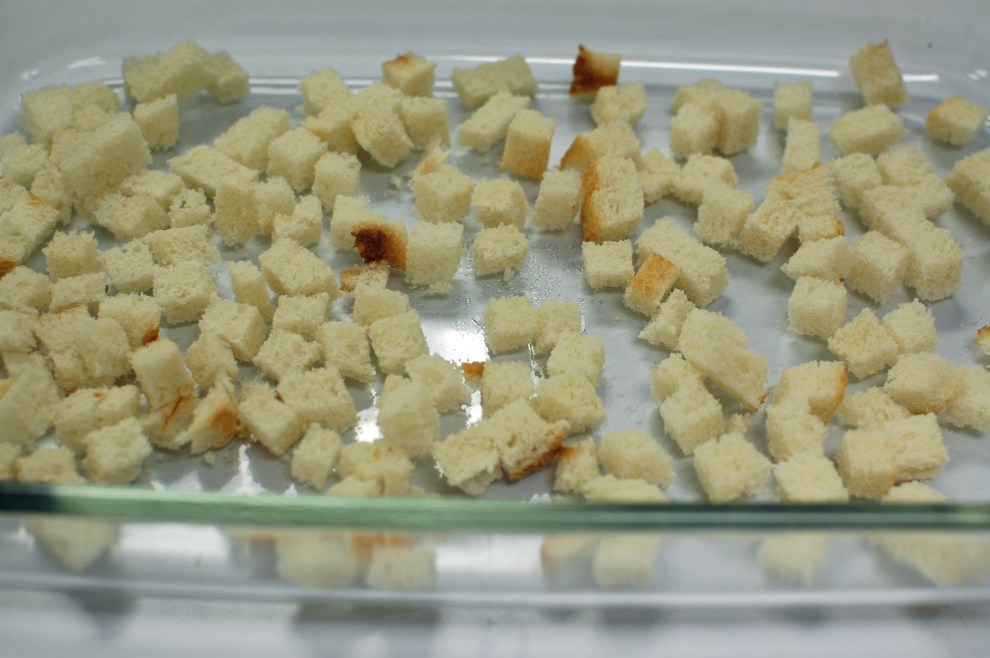 1. Place 3 slices of the cubed bread into a greased 9 x 13 inch casserole dish.