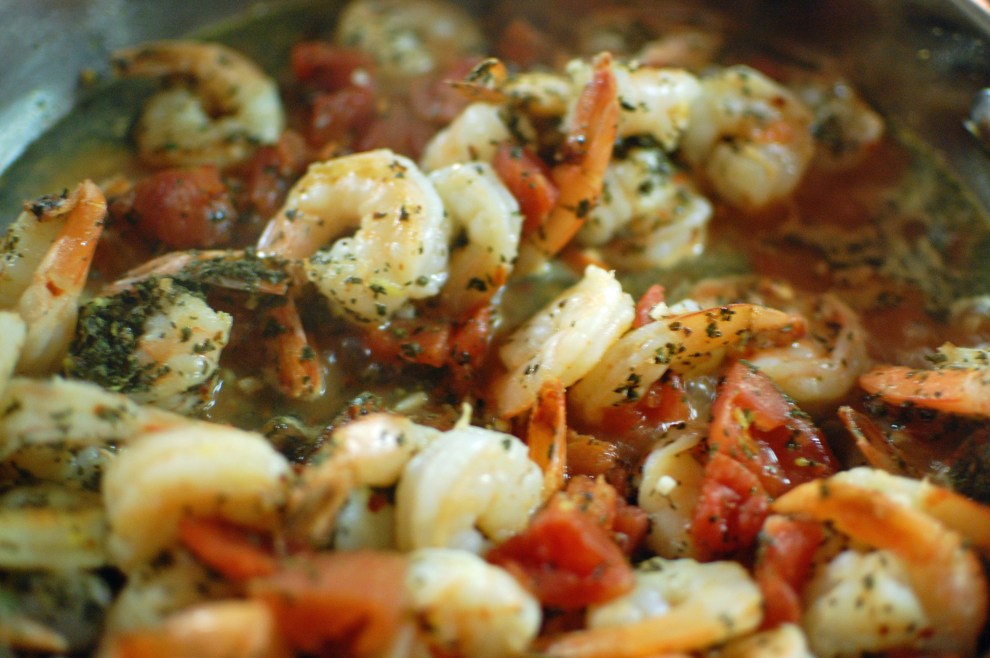 You dish is a perfect example of how easy and delicious making dinner at home can be. If you want a variation cook the seasoned shrimp in 3 tablespoons of oil and substitute 1/2 cup of white wine for the tomatoes. Leave out the basil, lemon juice and zest.