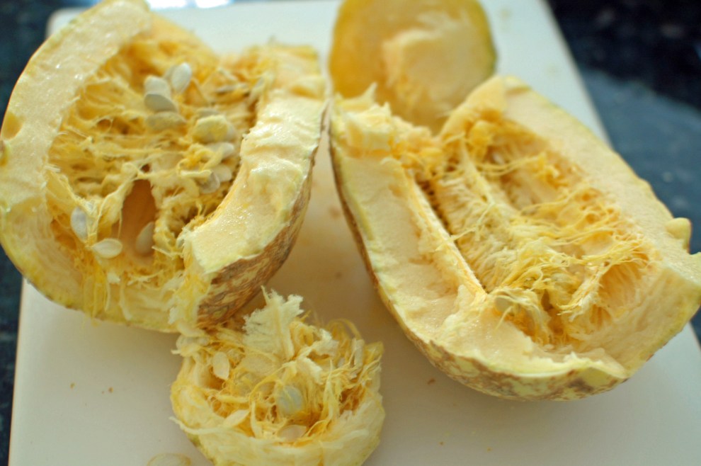 Splitting this large squash was the hardest part for me.  If you aren’t careful you could hurt yourself.  Scrape out the seeds and discard.