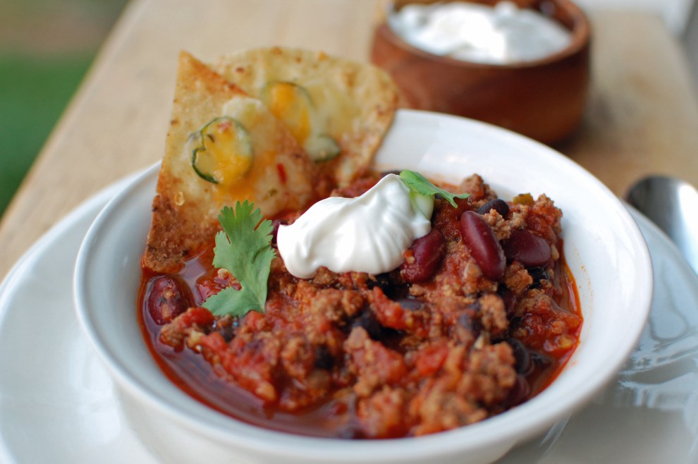 - Serve chili in bowls topped with sour cream and cilantro. Stand a nacho or two in the chili. Enjoy