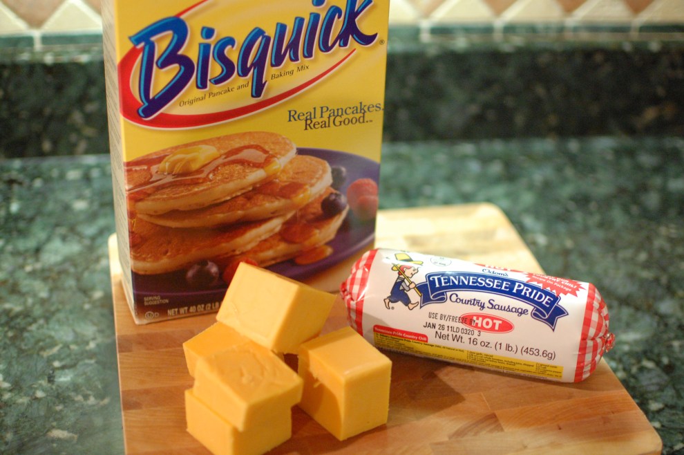1 lb. of sausage ( I like to use hot), 3 cups of Bisquick , 1 lb. of sharp sausage and if you like 1/2 teaspoon of red pepper or hot sauce