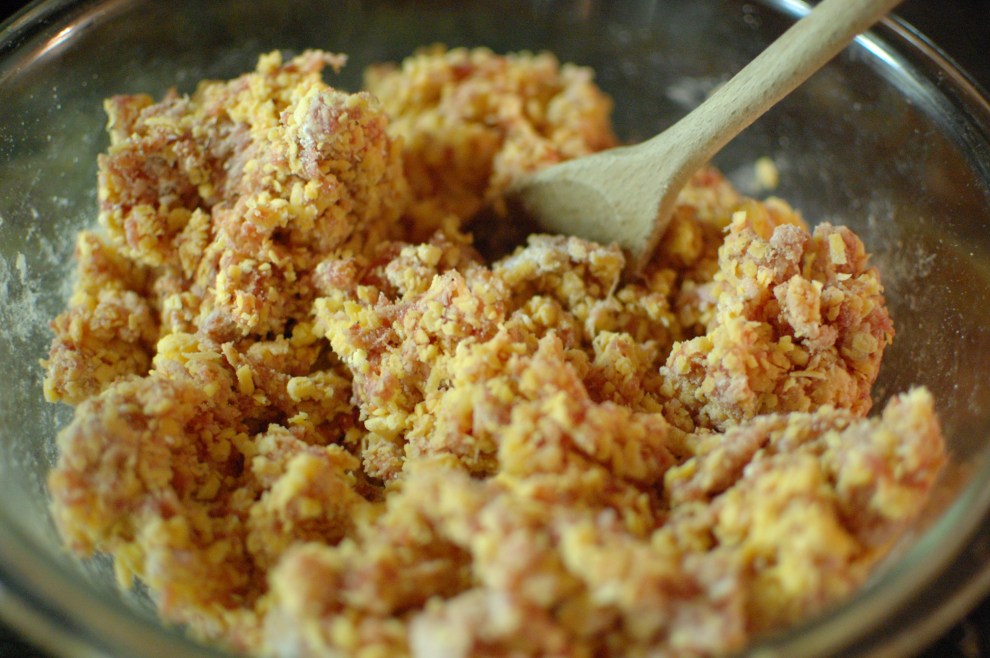 - Mix finely grated cheese, sausage, and 1/2 cup of Bisquick with a wooden spoon. Be patient. As the Bisquick is worked in with the sausage and cheese add the rest of the Bisquick about 1/2 cup at the time until all is worked in. Or just use your electric mixer to do the work for you!!! It’s so much easier.