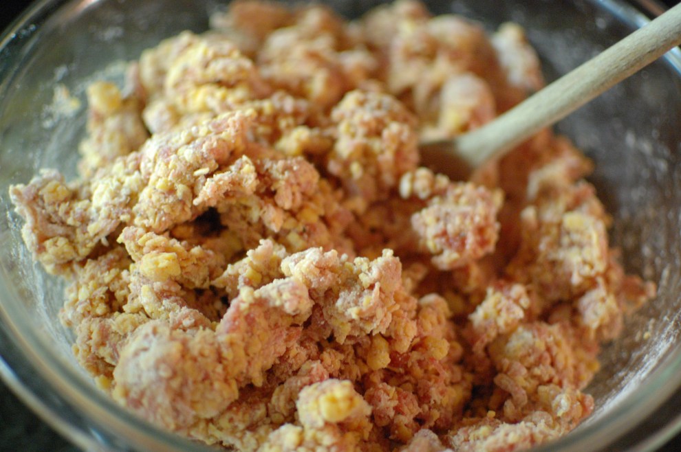 Just a little advice to make the mixing a little easier. Take the sausage out of the refrigerator about 30 minutes before mixing with the other ingredients. Measure out 3 cups of Bisquick, but don’t add all of it at once. Work in about 1/2 cup at the time with a wooden spoon. Here is cheese, sausage, and 1 cup of Bisquick.