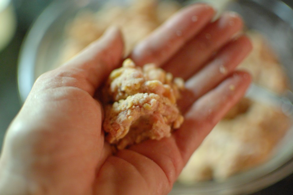 Using your hand lightly roll about a tablespoon of the mixture. Don’t mash the ingredients together with a heavy hand. You will end up with a bunch of rocks!