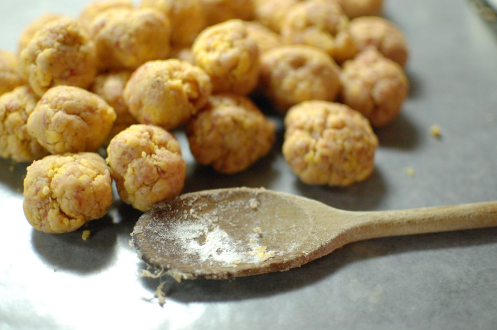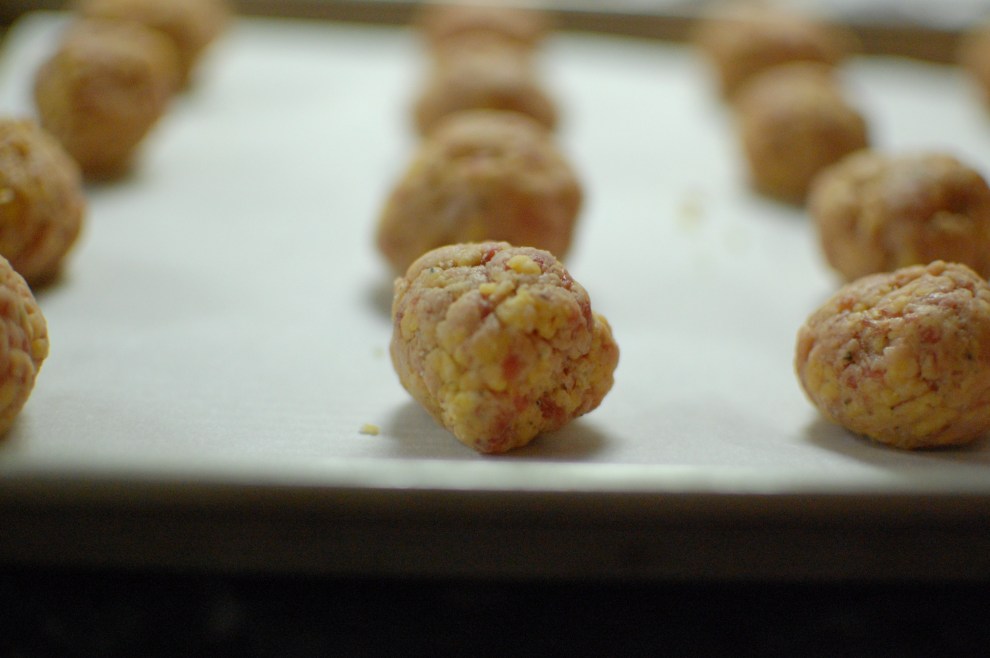 These little jewels are easy to make, but still many cooks get impatient and handle the dough too much resulting in very compact little biscuits. Just be aware that you should not hurry up the process. It takes awhile to work in the flour mixture. The sausage balls should be light and fluffy not dense and hard. If you follow these steps your product will be something that is great to eat and not a tool for breaking up ice on your driveway.