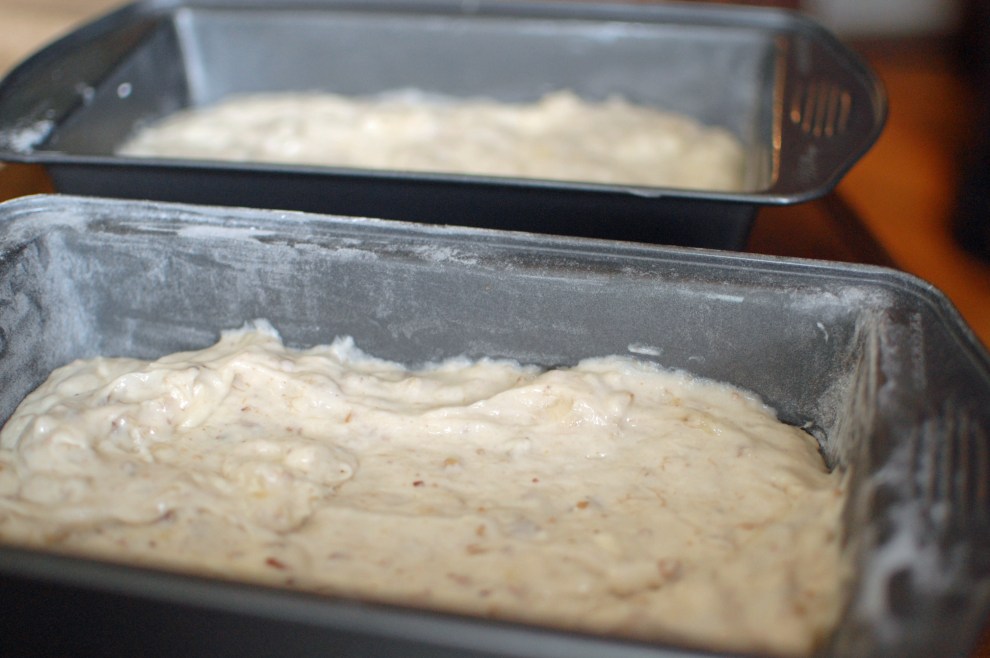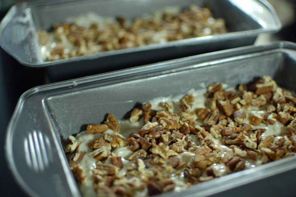 6. Spoon batter into 2 greased and floured loaf pans.   I used 9×4 inch pans.  Sprinkle 1/2 cup of toasted pecans to the top of each pan