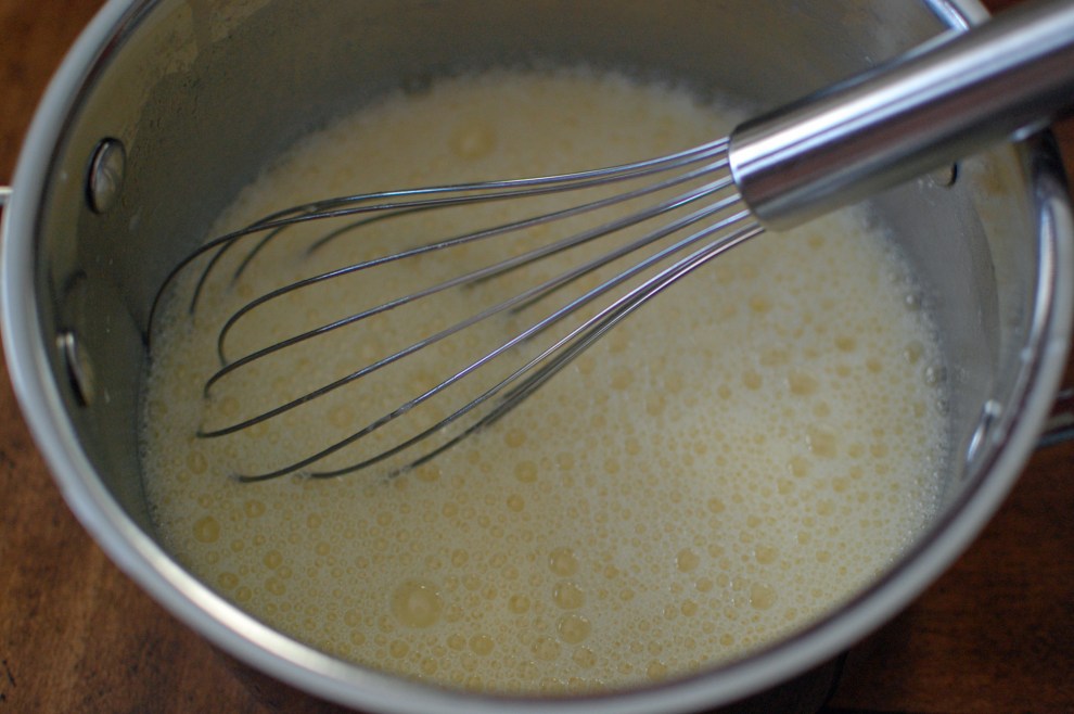 Milk, eggs, flour, and sugar in a sauce pan.  Cook over medium low temperature for about 40 minutes or until thick.  Your cook top may vary wildly from mine and it could take less time to thicken.  I started timing as soon as I put the saucepan on the range.   Just be sure to watch this carefully as it will scorch in no time.