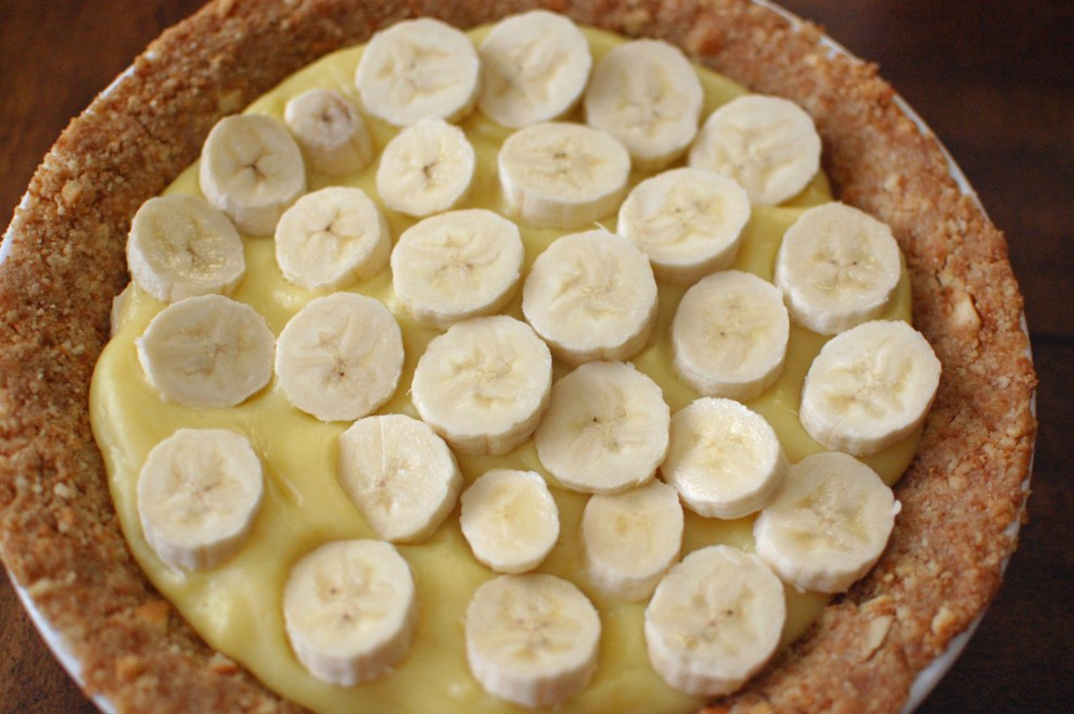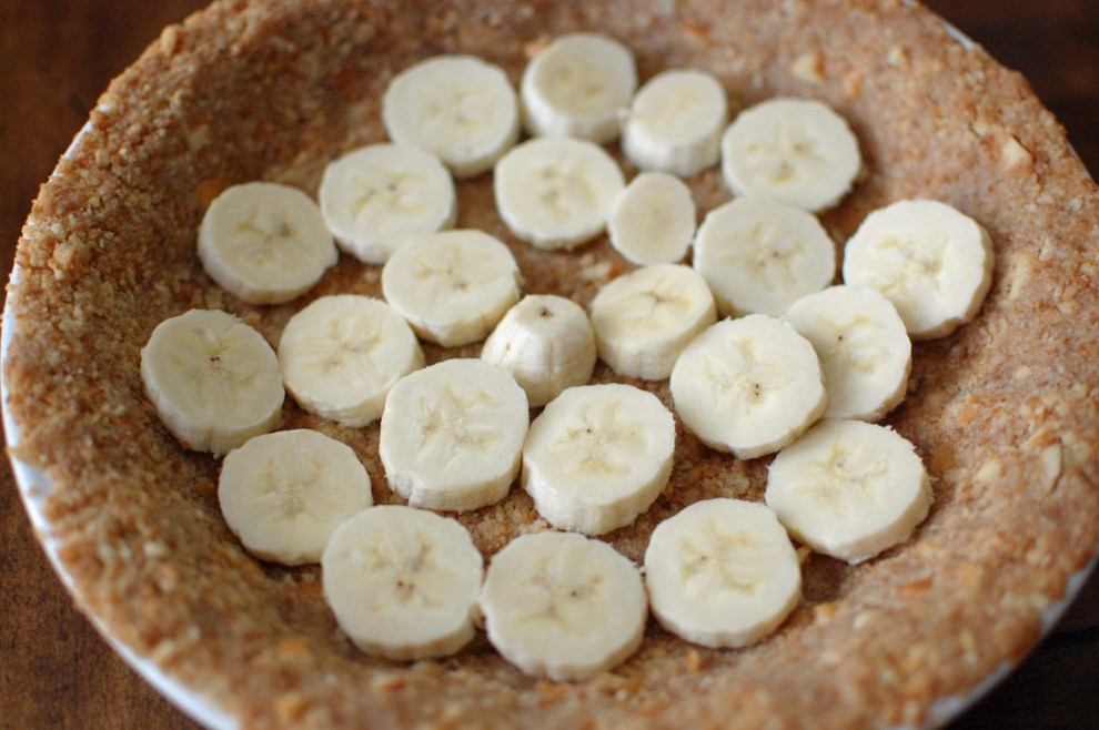 After the crust as cooled for 30 minutes  place a sliced banana in the bottom.