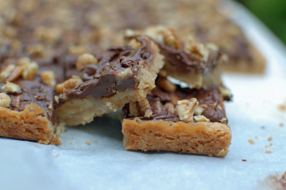 I tasted these little bars of goodness at a tennis match.  If you don’t know anything about ALTA tennis you might not know that the food served is sometimes more important than the score of the match.  I don’t remember if I won or lost the day I was introduced by my friend Betty to Pecan Turtle Bars, but their gooey texture, buttery shortbread layer, and chocolate top won me over for sure.  That next week my blogger friend Grace who wows me with her cooking as well as cracks me up with her humor had these bars posted.  It was fate!  I was destined to make them.