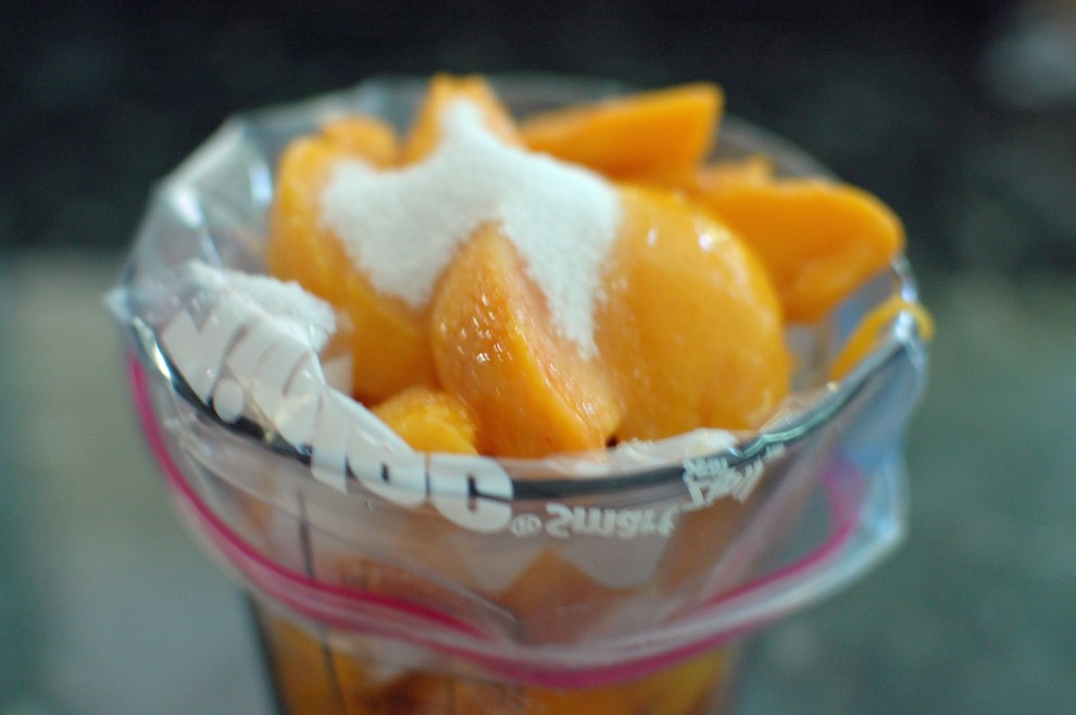 Place a quart freezer bag in a measuring cup. Place about 1 Tablespoons of sugar in the bottom of the bag. Fill with peaches and top off with 1 more Tablespoons of sugar.