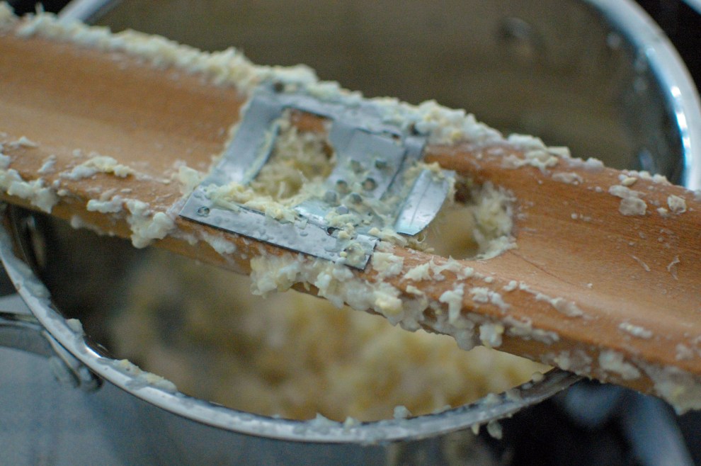 The afternoon that I brought it home G I Joe and I took the husk off and the silk. It took about 45 minutes. I placed all of the corn in a bag and put it in the refrigerator. Thank goodness for the extra one in the garage. The next morning I put my work clothes on and headed to the kitchen for a long morning. First on the agenda was cleaning under running water and removing the leftover silk. That was fairly easy. Now this next step is hard work! I have an old corn cutter that I have had since I left McRae. This is it. If you are going to work with more than a dozen ears of corn invest in this little apparatus! The blade is adjustable and it might take a few tries to get it right. I like a lot of cream with the corn so I cut it off short the first time and run the cob over the blade to get more cream. To cut a bushel of corn it probably took me about 2 hours. Try to enlist some help because your hand is going to be really tired.