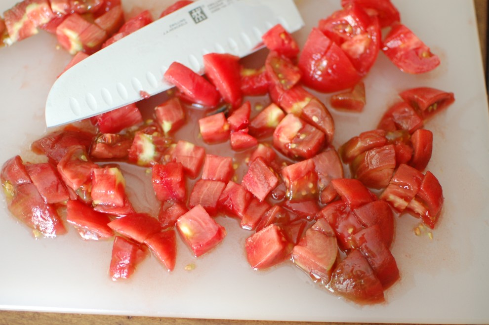 - Toss the pulp left of the grater in with the cut tomatoes.