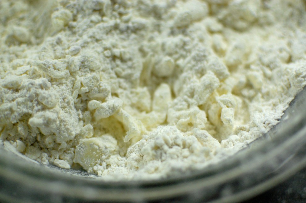 - With a pastry blender, two knives, or a fork cut in the butter until the largest lumps are the size of fat peas.