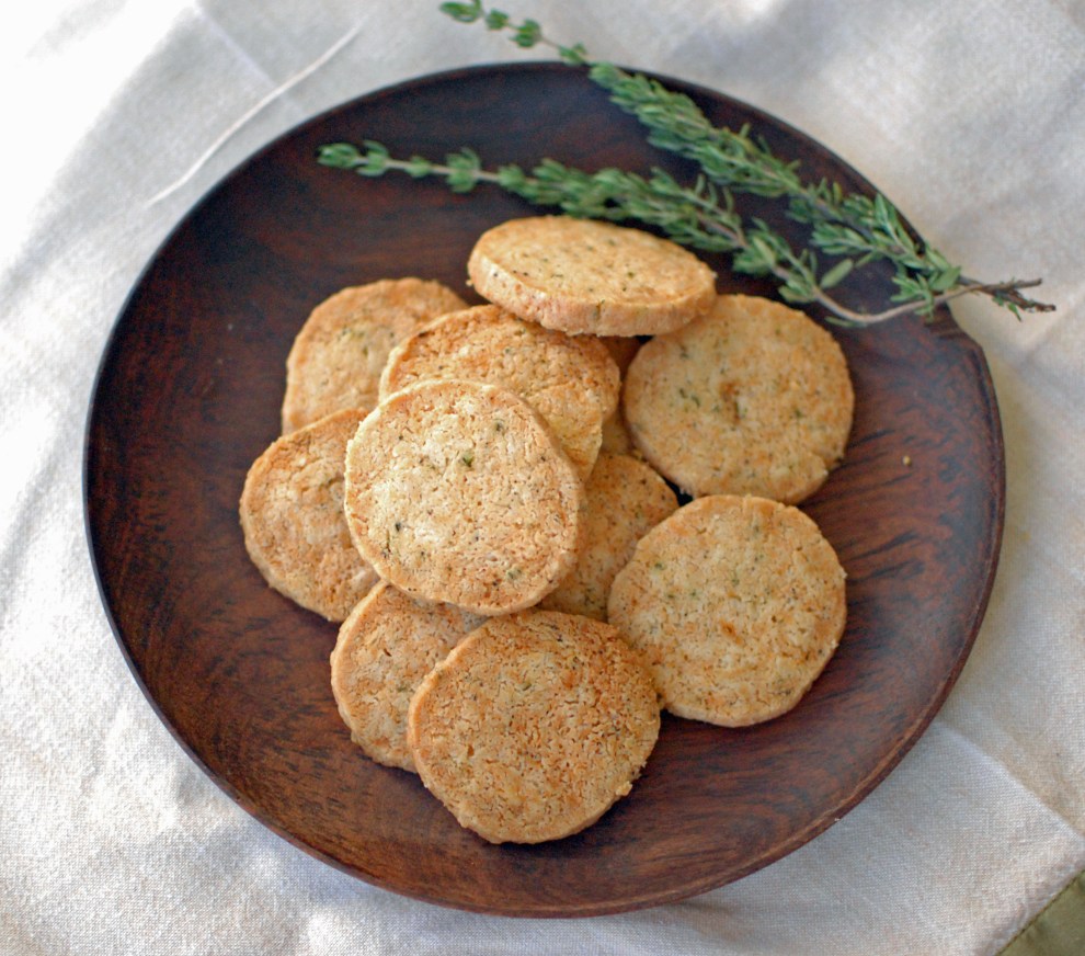 When I was in college I made a 100,000 cheese straws for every President’s tea, Alumni luncheon, or fundraiser that was held while I was there. It seems that one would tire of a certain food when one had to produce that many in such a short time. But, that is not the case. I still love them and when I saw this recipe in Ina Garten’s Back to Basic Cookbook using freshly grated parmesan cheese I had to try them. These are similar to cheese straws in some ways, but much more rich and oh so flavorful. In other words they are absolutely divine. These crackers are a buttery shortbread with the saltiness of parmesan cheese and a hint of thyme. Novice cooks these are just for you to pull out of the oven and place on a beautiful tray at a party. I promise they will be a hit!