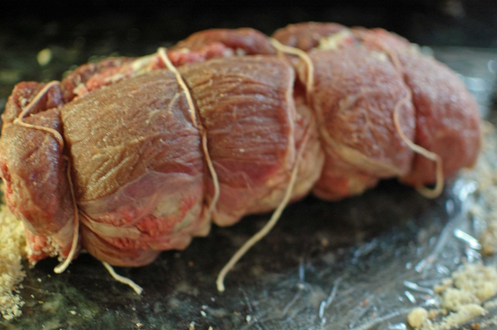 Roll up the meat starting on the long side. Then tie together. I used 4 pieces of twine about 10 inches long. Place the twine under the meat before rolling it.