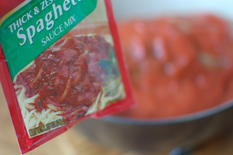 - Add tomato sauce, oregano, basil, parsley, bay leaf, and spaghetti mix. Stir until mixed. Thin out if necessary with water.
