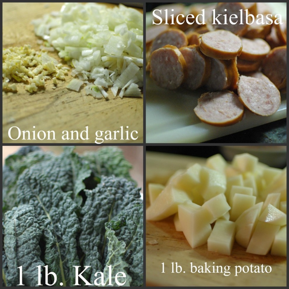 The simple ingredients are pulled together to make a soup that’s really good for you , yet comforting at the same time.  It is what I call PERFECT!  Ingredients are kale, onion, garlic, potatoes, sausage, salt, pepper, water, olive oil, and a little hot sauce.   Simple.   Gourmet gives you two choices for the sausage.  Use either chourico or linguica both are Portuguese sausages or just use kielbasa.  Some of you are frowning now at the choice of kielbasa, but it worked and it worked well.  It may be better with the authentic Portuguese sausage and I can’t wait to try it, because I really don’t know how much better the soup could be.