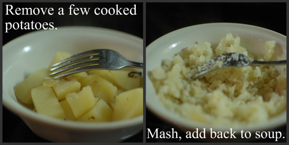 5. Mash some of the potatoes into the soup to thicken, then add kale and simmer uncovered, until tender, about 5 minutes.