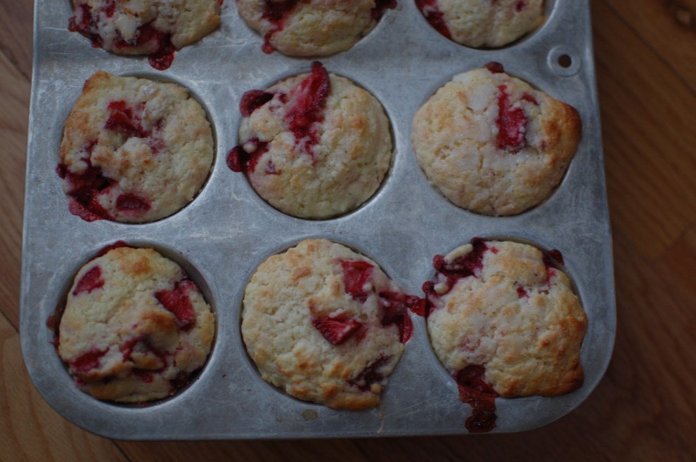 Do you love strawberry shortcake?  I have just the recipe for you, but less trouble and less calories.  This is a fabulous muffin recipe and I know because I have made my share of muffins with high school students.  Since  I just received my first strawberries of the season in my CSA box I was searching for a great recipe.  I did not have to go far.    The new issue of Southern Living coincidentally featured strawberry recipes ranging from strawberry pie to strawberry curd this month.  There many great looking  recipes using strawberries.  I didn’t have to make a choice because my friend Syble mentioned to me that she tried these strawberry lemonade muffins which were divine.  I was sold .  Her word is gold and I love it when I don’t have to make decisions.