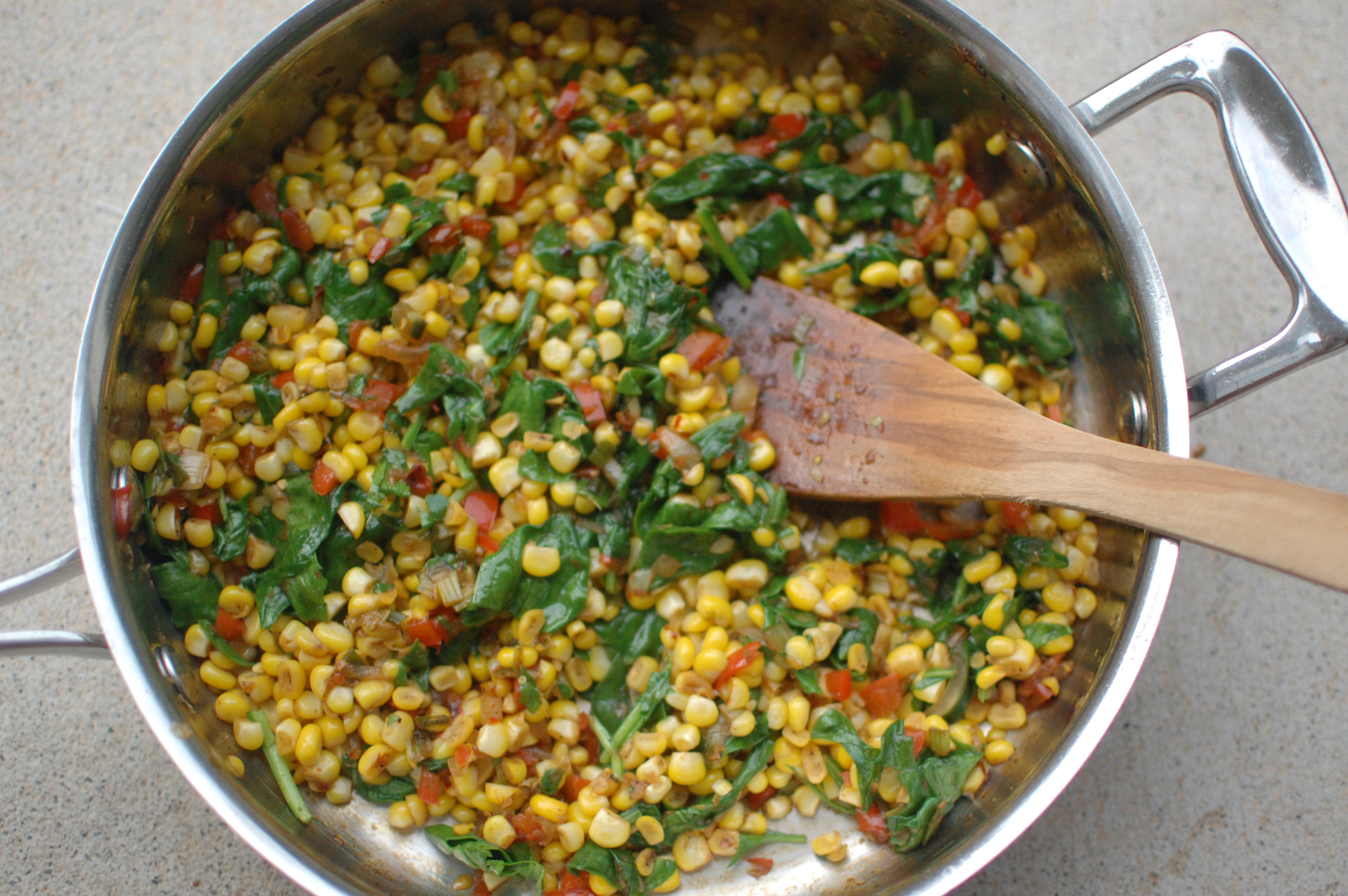 Sautéed Corn, spinach, Bacon, and Scallions changed a little from Katie Workman