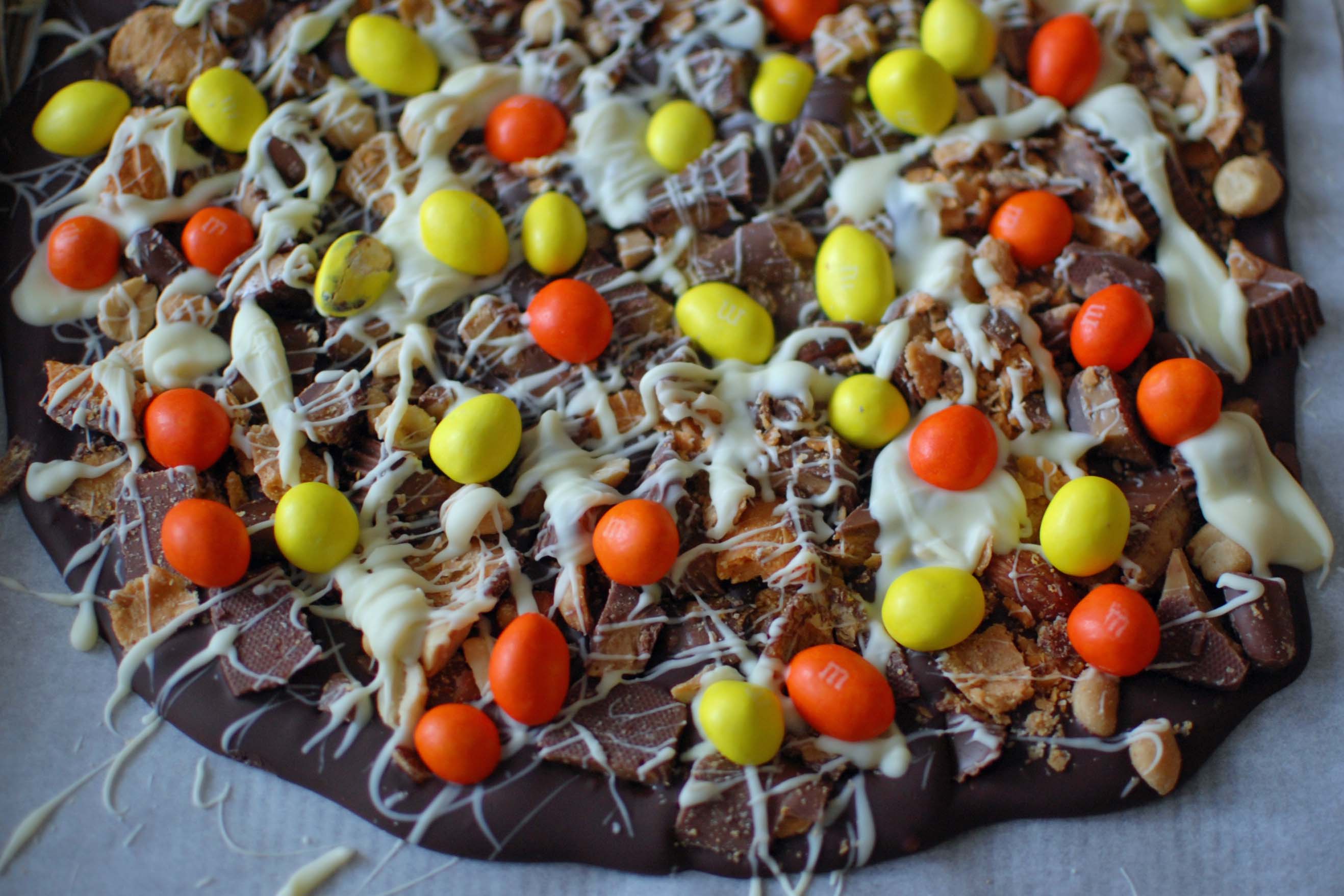 - Sprinkle Butterfinger, toffee, peanut butter cup, and nuts. Save the M&M’s to put on after drizzling the white chocolate.