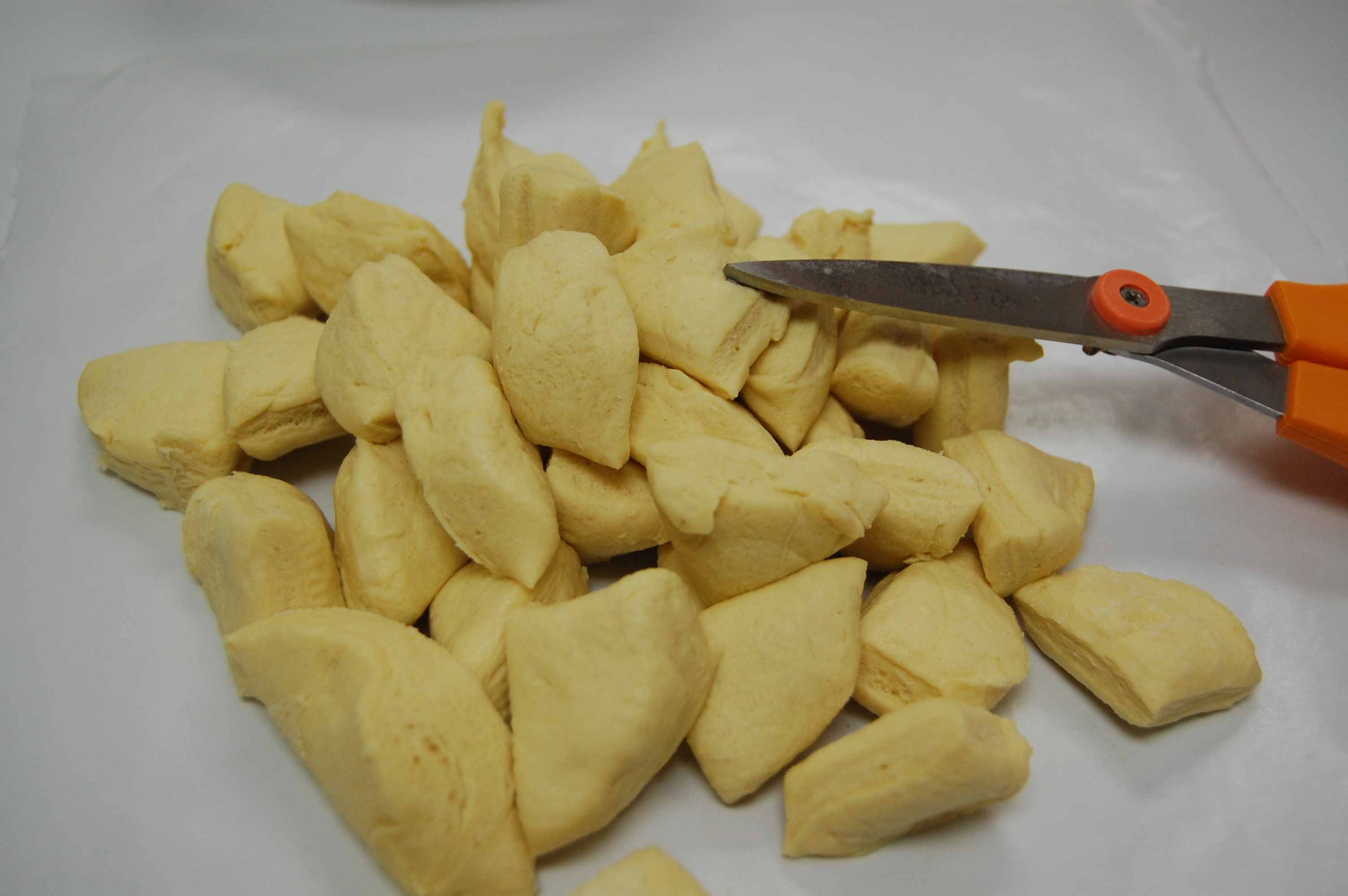 Using a pair of kitchen shears cut 12 oz. of refrigerated biscuits into quarters.